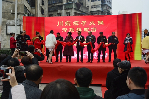 涪陵区委统战部副部长、工商联党组书记杨会,中国个体劳动者协会副会长、重庆市民营经济协会会长、重庆理想投资集团有限公司董事长周伟,涪陵区政协委员、区餐饮协会会长、川东坝子火锅董事长刘明杰,重庆银林餐饮有限公司董事长张秀容,武隆区餐饮协会会长毛明,垫江饮食行业协会会长袁荣,泽胜商业管理有限公司总经理张永忠,泽胜中央广场总经理王晓元,川东坝子总经理王星文,财务总监刘萍共同上台为川东坝子火锅涪陵泽胜旗舰店开业盛典剪彩。(陈孝波)