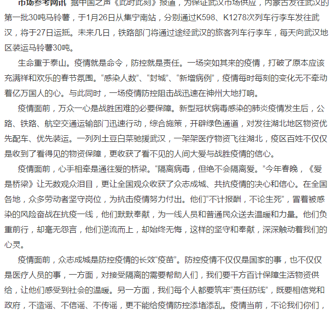 市场参考网讯 据中国之声《此时此刻》报道,为保证武汉市场供应,内蒙古发往武汉的第一批30吨马铃薯,于1月26日从集宁南站,分别通过K598、K1278次列车行李车发往武汉,将